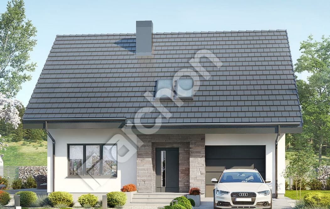 Funkcjonalny projekt domu o prostej bryle, z subtelnymi dodatkami elewacyjnymi podkreślającymi jego współczesną formę. Otwarta strefa dzienna łączy wygodny salon z jadalnią i kuchnią, dając możliwość różnorodnej aranżacji przestrzeni. Szerokie otwarcie na ogród powiększa optycznie wnętrze oraz pięknie je doświetla. Atutem kuchni jest duża ilość blatów roboczych oraz możliwość zastosowania wysokiej zabudowy.